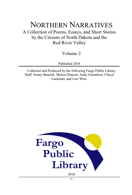 Welcome to the second volume of Northern Narratives. This anthology features selected poems, essays, and short stories submitted to the Fargo Public Library during the Winter Read-A-Thon, which ran Jan. 8 – March 4, 2018. We hope to make the project an annual event.